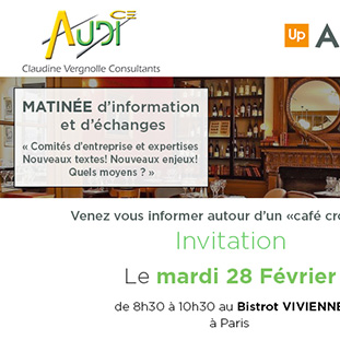 AUDI-CE Claudine Vergnolle Consultant vous invite au « 70e anniversaire des comités d’entreprise » Cette manifestation se déroulera le mardi 24 novembre 2015, de 14h00 à 19h00, à l’Espace du Centenaire (Auditorium de la Maison de la RATP) 189 rue de Bercy – 75012 Paris. A l’occasion du 70ème anniversaire de la création des comités d’entreprise en…